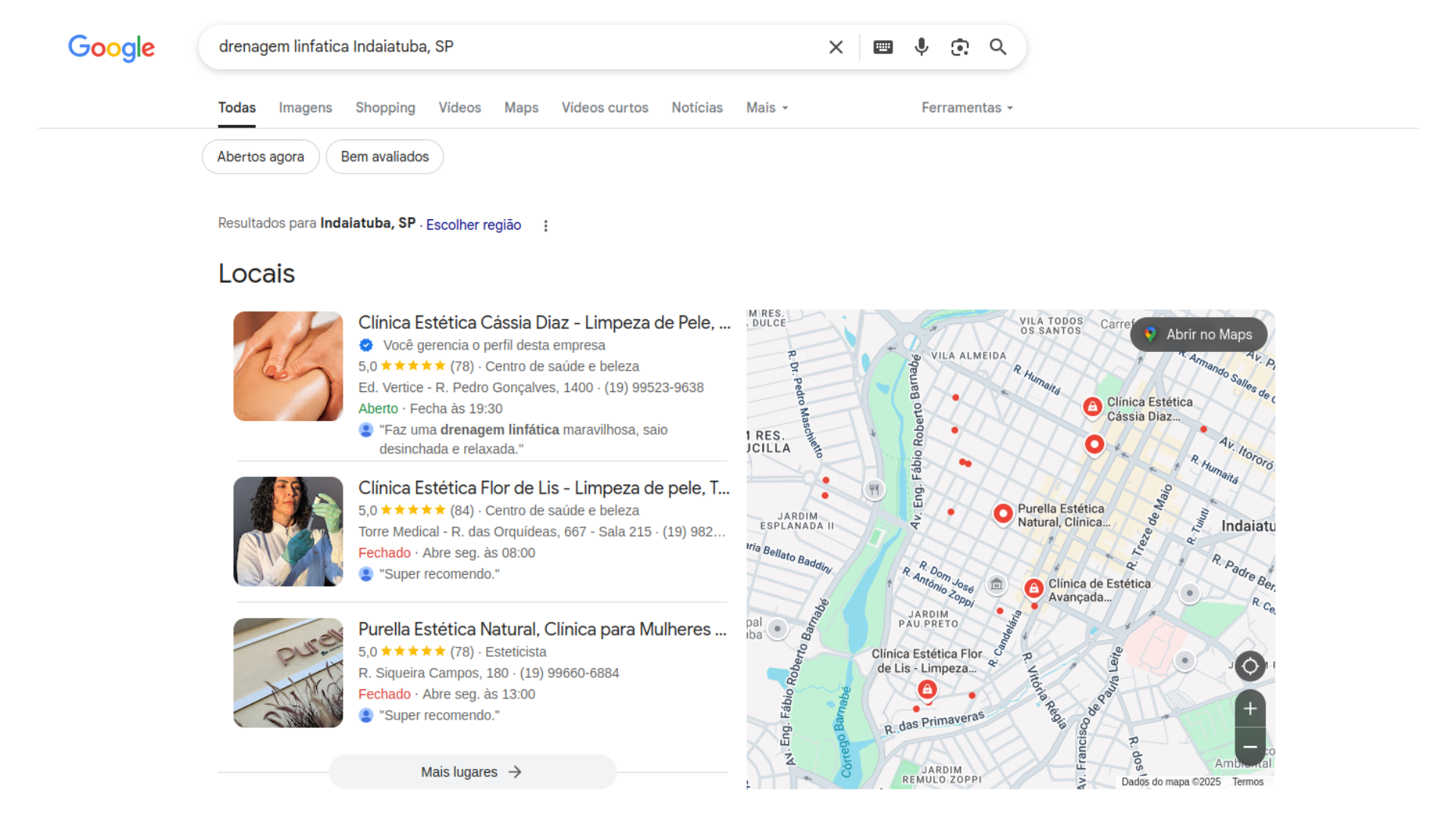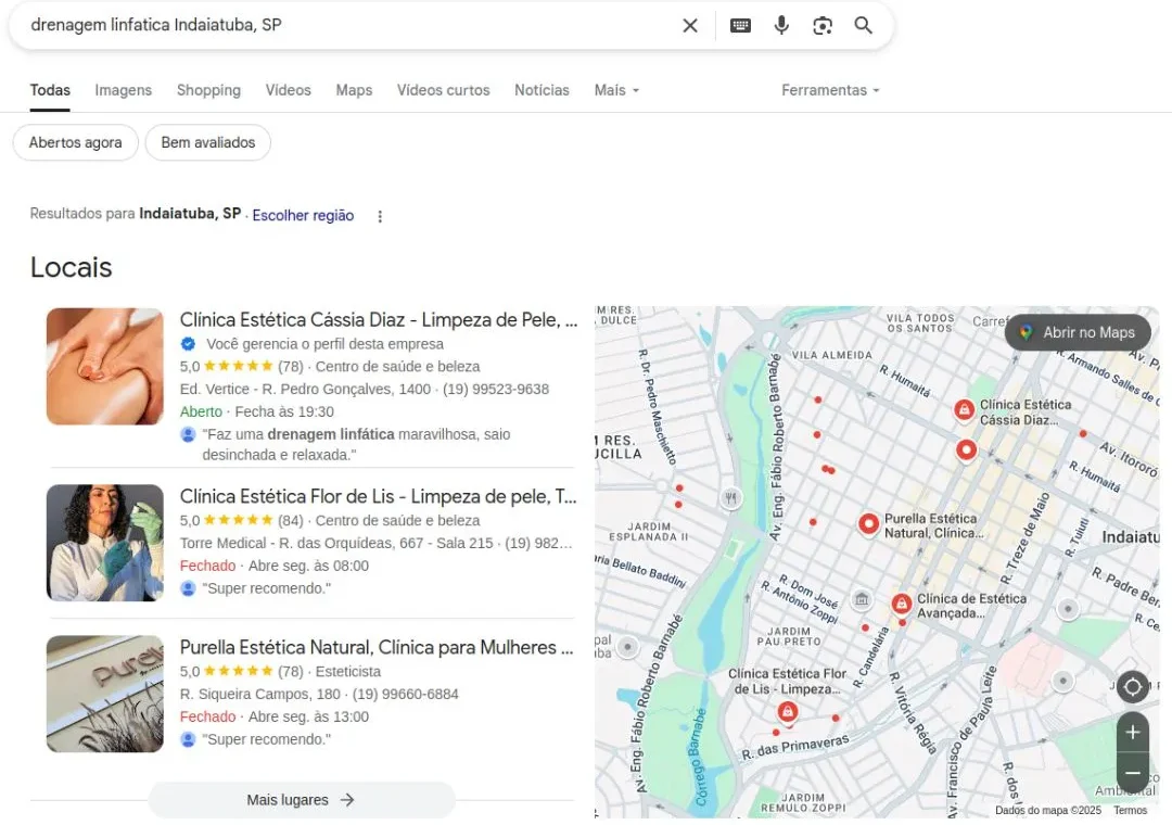 Com a nossa otimização estratégica e contínua do Google Meu Negócio, ela saiu do anonimato digital. Hoje, a Clínica Cassia Diaz Estética não apenas aparece, mas domina as primeiras posições no Google Maps e na Busca para termos altamente competitivos, atraindo um aumento significativo de agendamentos de novos contatos qualificados por mês.